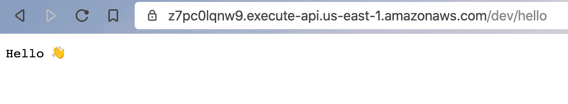 You get a URL for your lambda and some debugging output. My URL is https://z7pc0lqnw9.execute-api.us-east-1.amazonaws.com/dev/hello, if you open it in your browser, it says Hello π